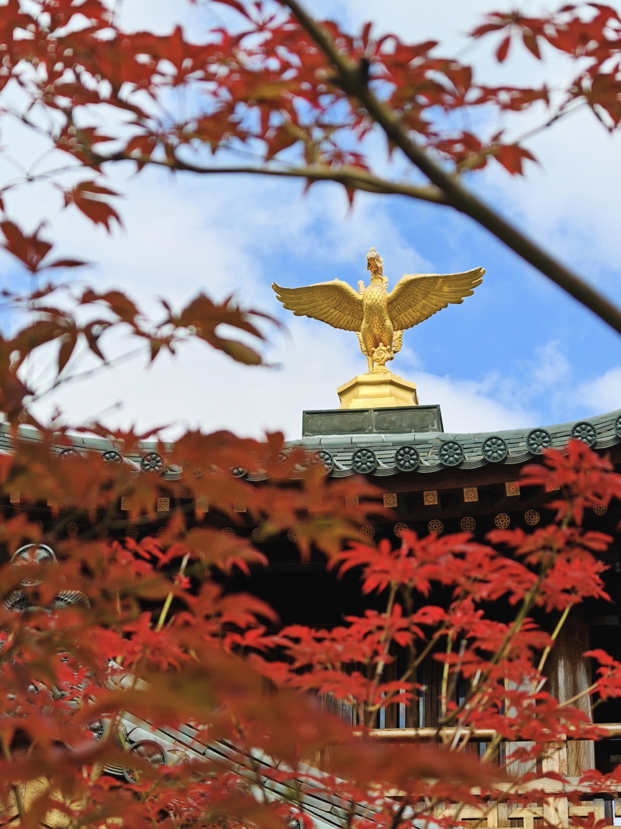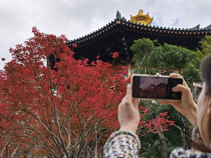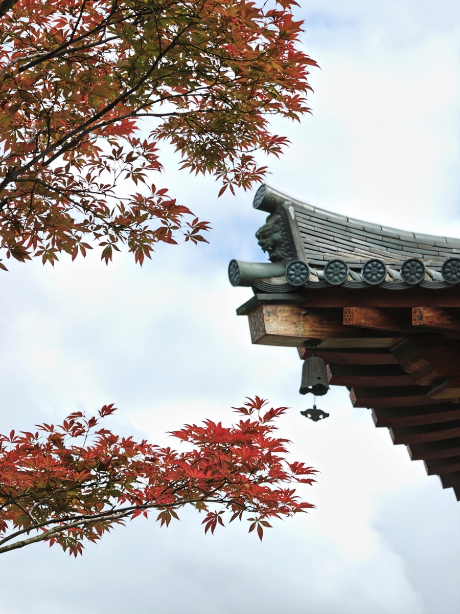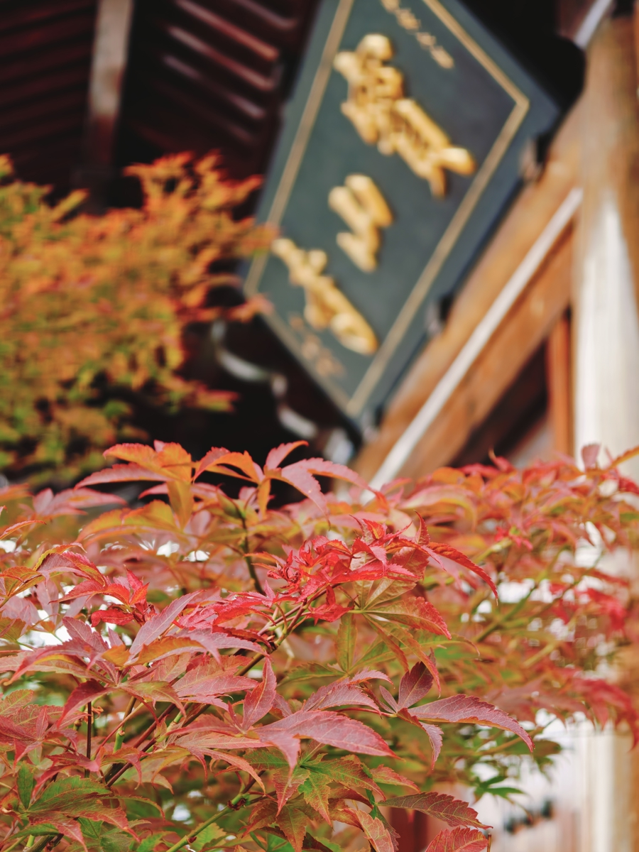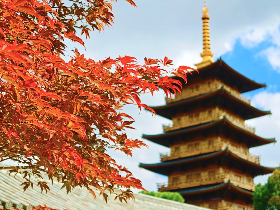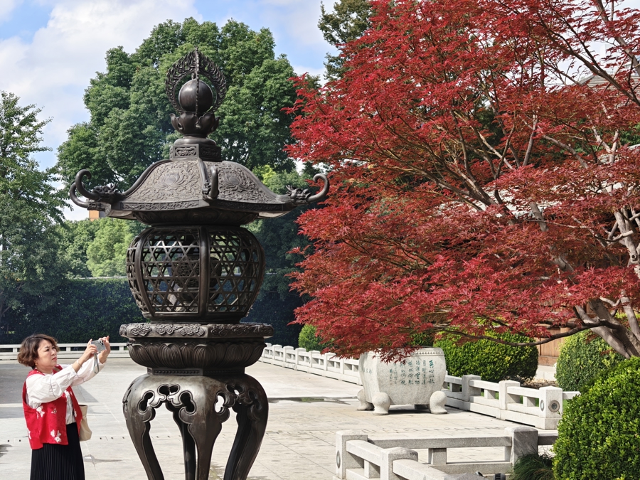 10月23日,上海迎来霜降节气。“上海最美唐风古建筑”宝山寺枫叶已染红。水天塔影,红枫摇曳,宛如古风插画,让人流连忘返。